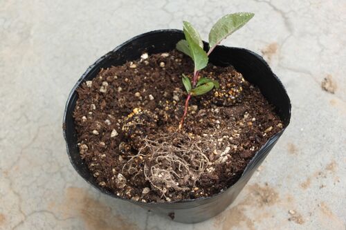 りんごの実生を少し大きめのポットに移植しました。セルポットの小さなスペースの中に、実生の根がぎっしり詰まっているものもありました。写真の実生は少し小ぶりのものです。4月下旬に、約210粒のりんごの種を蒔いて、今回約70ほど良いものを選んで…