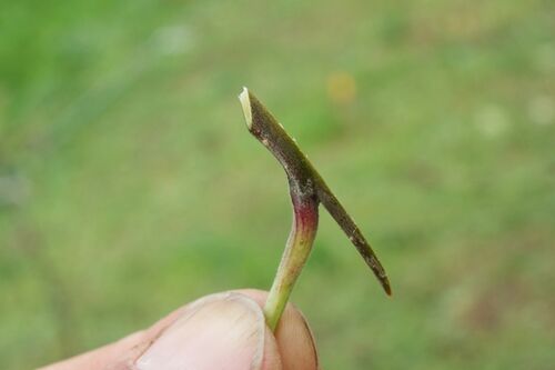 朝から芽接ぎ。( Chip Budding)まずはのせる穂(チップ)の切り出し。芽の下部分は30~40°の角度をつけて切り出します。 次にチップをはめ込む台木部分の切り出し。はめ込む芽と出来るだけ同じ大きさになる様に切り出します。切り出す下部分はチップ同様…