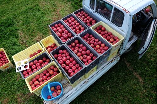 ふじ収穫中。 2分割。 4分割。 芯を取る。 もう半分に切って皮を剥く。完成。頂きます。