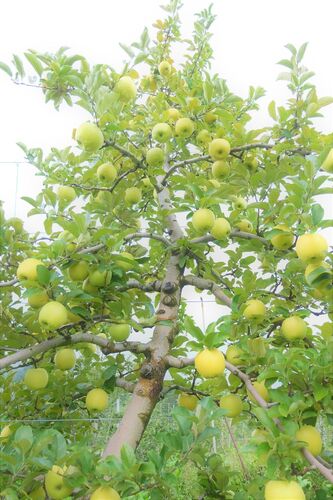 9月20日。紅の夢。左が除袋直後の果実、右が無袋の果実。 1週間後の9月27日の様子。無袋の果実の深い赤色にはまだまだ及ばないが、瞬く間に美しい赤色に染まった。 収穫期になってきたシナノスイート。台風が心配でならない。今回は過分に嫌な予感がするので…