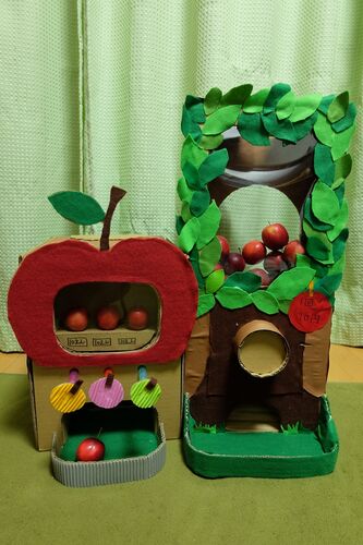小さいりんごが出てくる、自動販売機(左)とガチャガチャ(右)。ダンボールでつくりました。 明日のさんぽ市に持っていきます。どうぞ遊びに来てくださいね。
