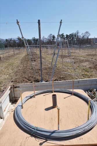改植に向けて仕事を進めています。昨年、一昨年と比べると、金具の使い方、V字の組み方など一見同じような仕事に見えて細部は色々と変更されています。なんでもそうだと思いますが、やってみないとわからないことは多々あります。ちなみに写真のVトレリスの…